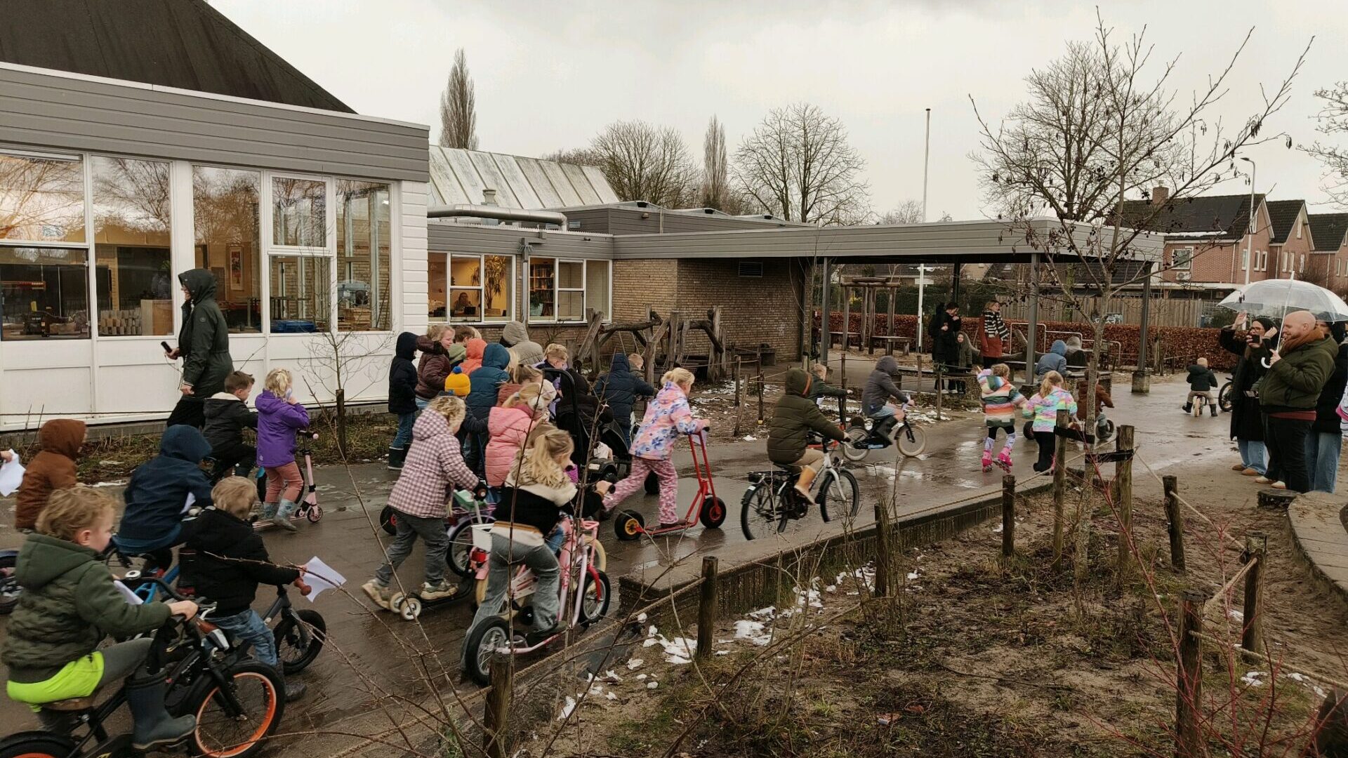 Het thema ‘de Olympische Winterspelen’ is afgesloten met een alternatieve Elfstedentocht op het plein. De kinderen waren er klaar voor om langs alle 11 steden te steppen, fietsen of skeeleren en zo stempels op te halen. Helaas gooide het weer, hagel en heel veel regen, roet in het eten…. De commissie moest de barre tocht voortijdig beĆ«indigen, om taferelen zoals tijdens de legendarische editie van 1963 te voorkomen. Ondanks dit hebben de kinderen genoten! Er werd binnen een speurtocht gedaan. De koek en zopie maakte een hoop goed!